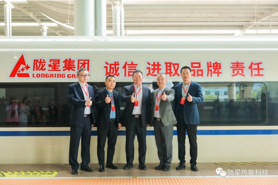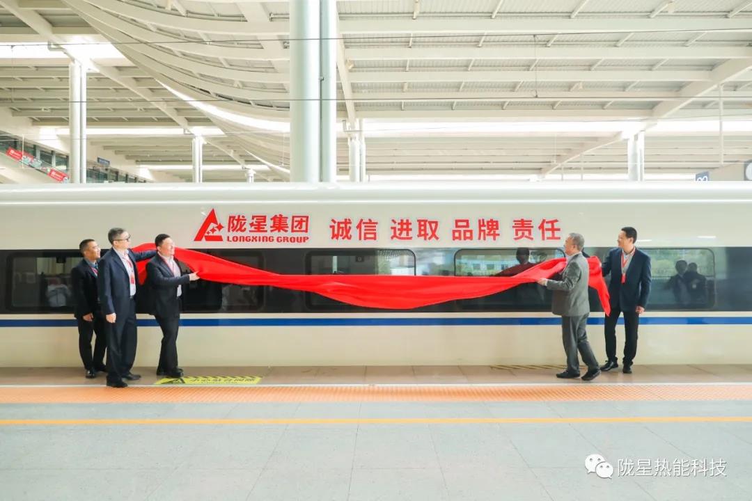 在首發(fā)儀式工作人員的引導(dǎo)下,出席隴星集團高鐵冠名首發(fā)儀式的領(lǐng)導(dǎo)及嘉賓來到了隴星集團高鐵冠名列車所在的站臺。主持人邀請隴星集團副總、隴星熱能科技公司總經(jīng)理趙明珠先生與華鐵傳媒集團副總裁杜勁松先生,以及隴星熱能科技公司三位員工代表共同為隴星集團的高鐵冠名列車揭幕,現(xiàn)場響起了熱烈的掌聲,站臺上來來往往的乘客也駐足觀看,高鐵列車上紅色的隴星集團LOGO及隴星企業(yè)精神八個大字格外引人注目。